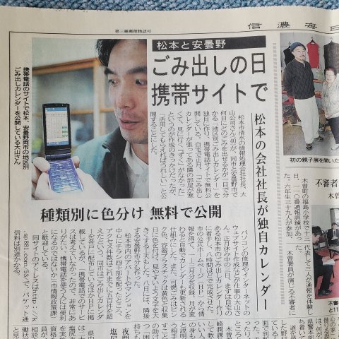 当時、自治体ゴミ出し日待ち受けアプリの取材(信濃毎日新聞)